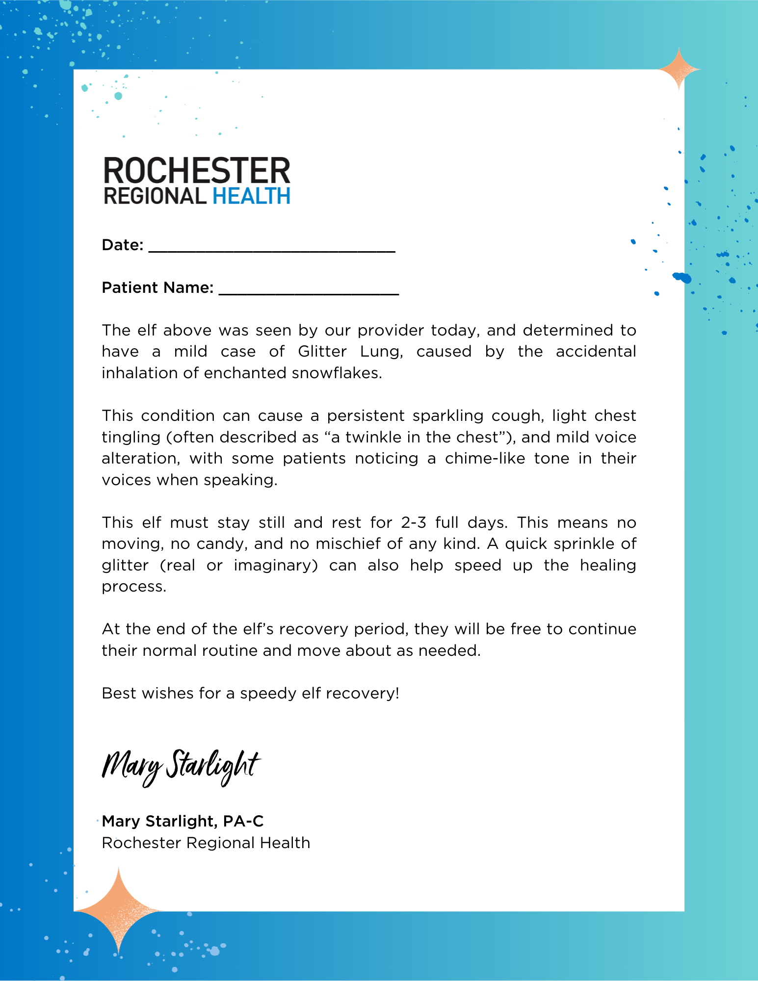 Post the diagnosis: Print the Glitter Lung doctor's note and place it prominently. This gives you 2-3 full days of no moving, no candy, and no mischief.