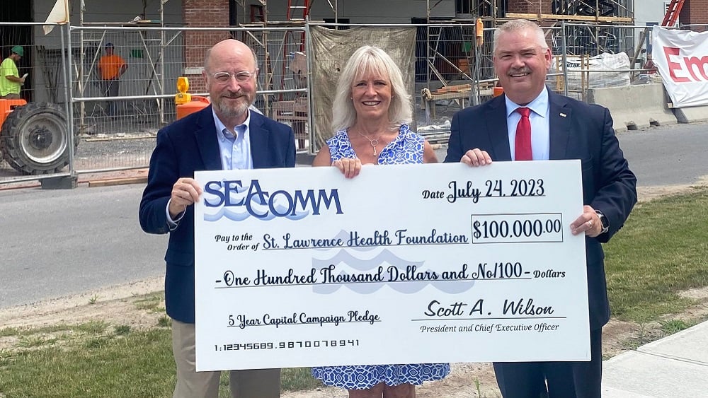 “Our $100,000 pledged gift to the St. Lawrence Health Foundation is a concrete way to show our commitment to the community by assisting St. Lawrence Health in meeting its mission and its hospital construction expansion,” stated SeaComm President and Chief Executive Officer Scott Wilson.